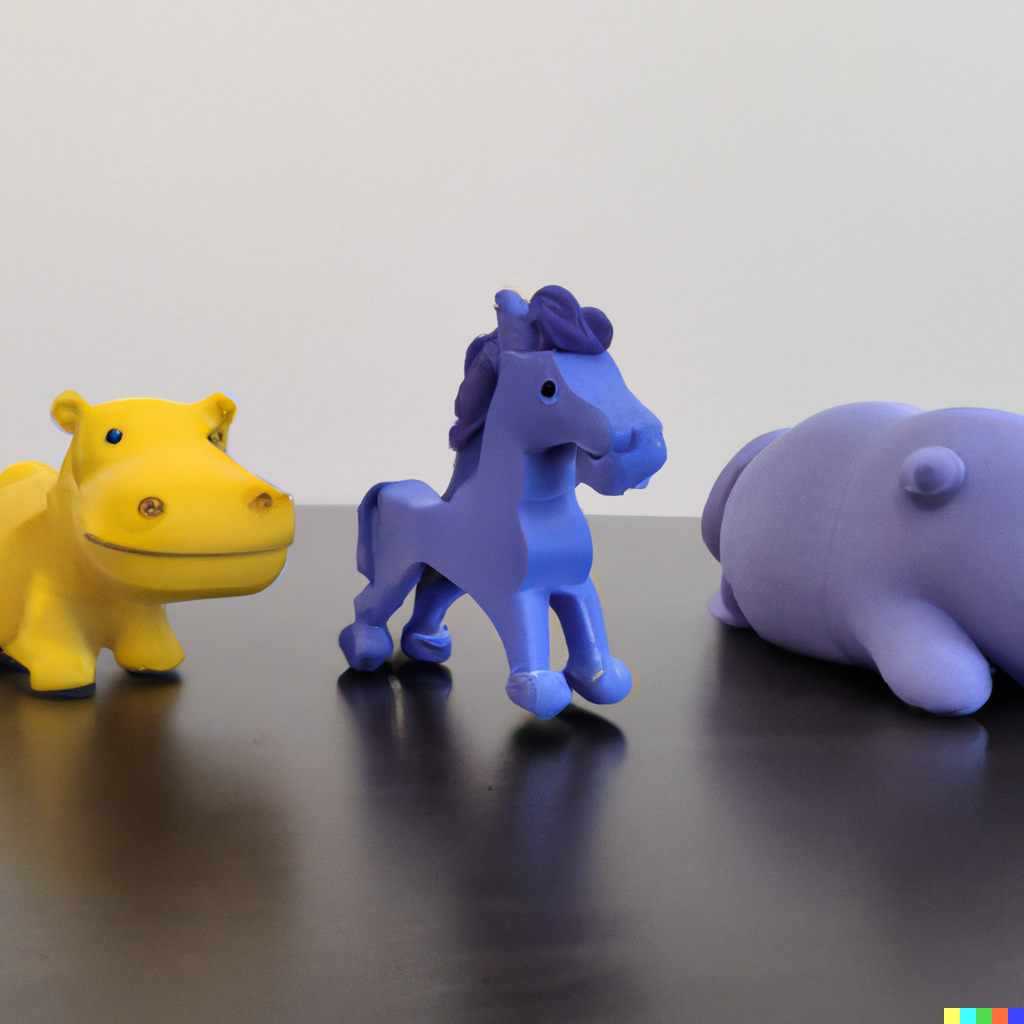 Naar mate we op de lijn steeds verder naar rechts gaan verdwijnt steeds meer iedere gelijkenis of zelfs herinnering aan het origineel, totdat uiteindelijk de werken gewoon echt helemaal niets meer met elkaar te maken hebben. Zo zouden we bijvoorbeeld de dichtregels aan de ene kant van de lijn kunnen plaatsen en aan de andere kant het (meester)werk van prof. Visser en Dall E: “blue horse, purple dog & yellow hippopotamus” (uit de (inmiddels geactualiseerde!) stellingen over AI & IE (zie aflevering 2). Niets met elkaar te maken.