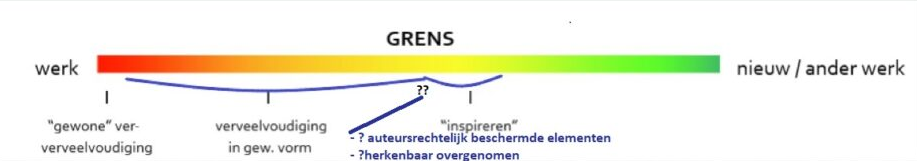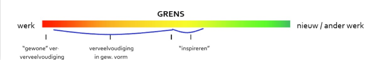 Bewegen we nóg verder naar rechts op de lijn, dan komt er een moment waarop we moeten zeggen: “OK: nu is er sprake van een nieuw, ander werk en niet langer van een verveelvoudiging in gewijzigde vorm. Vlak voorbij die grens zullen we eerst nog zien dat de maker zich inderdaad heeft laten inspireren door het oorspronkelijke werk (maar ook niet meer dan dat; anders waren we de grens niet voorbij gekomen).